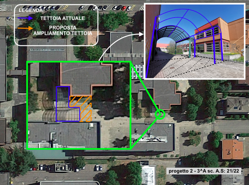 Un gruppo di ragazzi e ragazze della classe 3^A sc. ha elaborato questa proposta, con l'obiettivo primario di ampliare la tettoia già presente tra le sedi 1 e 2, in modo tale che possa garantire ad un numero maggiore di studenti il giusto riparo durante le giornate di pioggia.