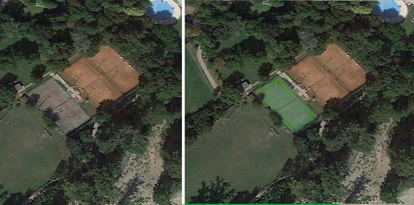 La nostra proposta prevede la trasformazione del vecchio campo in mateco del Centro Tennis delle Aree verdi adiacente al Centro Nuoto in un campo polivalente Tennis Calcetto in erba sintetica.