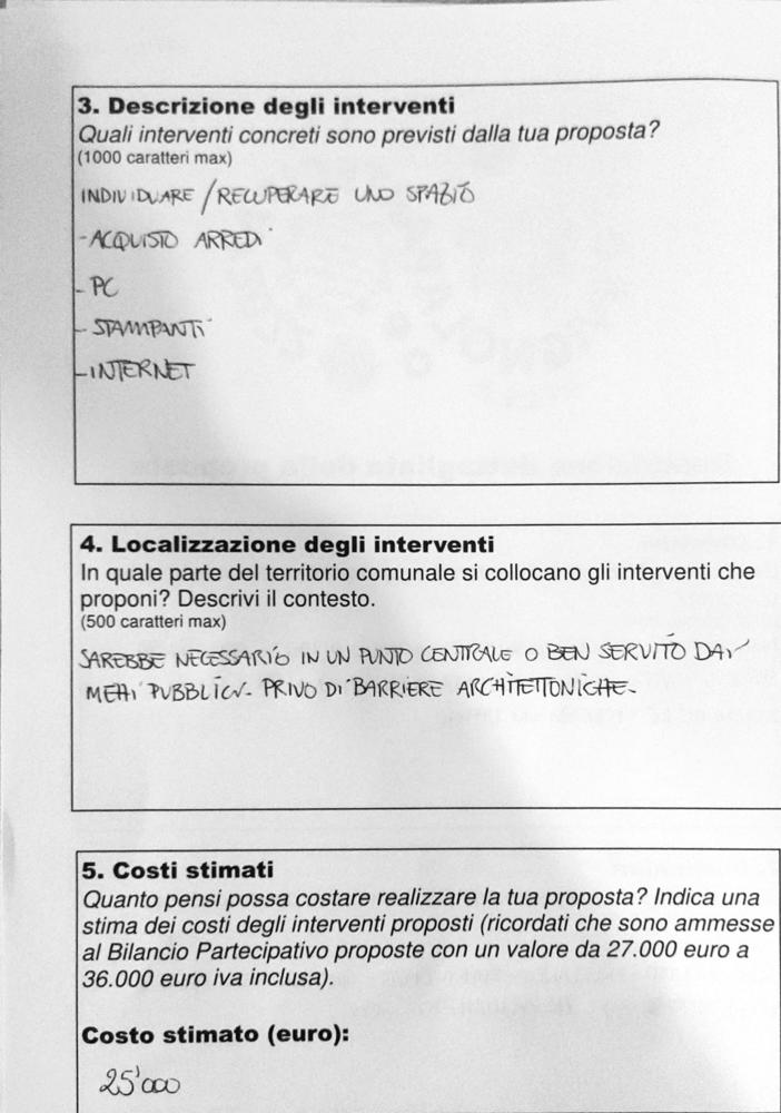 Accettata. La proposta è conforme ai requisiti definiti nel patto di partecipazione. E' stata accorpata alla proposta "punto di incontro, spazio polivalente, book crossing, open house. Punto informativo informatico evergreen" ed include parte del progetto originario "la piscina - un luogo per tutti"