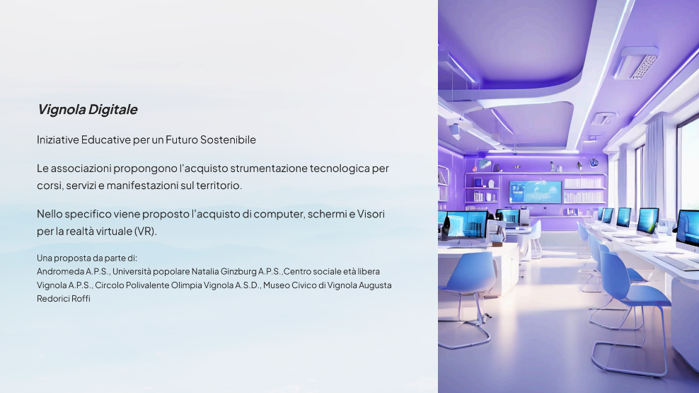 Acquisto di Strumentazione Tecnologica: Acquisire computer, schermi e visori per la realtà virtuale (VR) da utilizzare in corsi, servizi e manifestazioni sul territorio. Organizzazione di Laboratori Itineranti di Pittura Digitale: Utilizzare la strumentazione acquisita per creare laboratori di pittura digitale accessibili a vari gruppi demografici. Corsi sull'Intelligenza Artificiale: Offrire corsi sull'Intelligenza Artificiale presso l'Università Popolare Natalia Ginzburg, con l'obiettivo di educare il pubblico sull'uso di questa tecnologia in diversi campi.